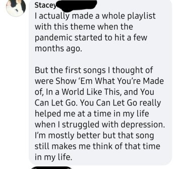 But I know when things are hard for me, music tends to be what heals me. It’s what reminds me things are going to be okay even if it seems like it won’t be right now. Music basically helps me feel what I need to feel while reminding me that no matter what it is I’m feeling, I’m not alone. And trust me when I say there’s been times in the past or even this year when I felt alone and needed to be reminded that I wasn’t, that others have felt and are feeling what I’m feeling, and that it will all be okay.