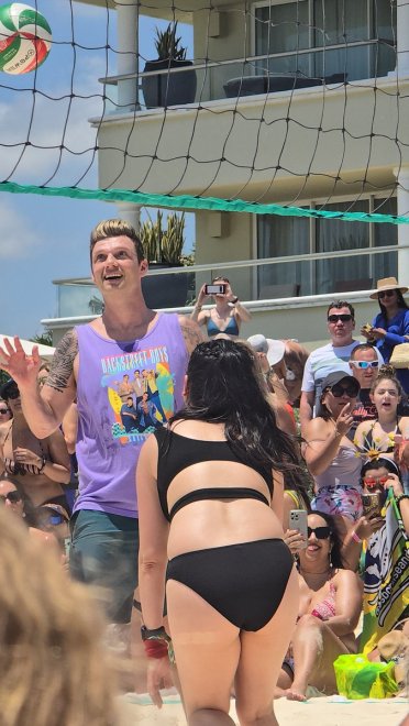 Let’s move on to the final day because this literally is an essay now and I’m so sorry! This is why it’s taken a bit for me to recap Cancun. Like I said before, I did a short summary on the Fanclub because I did it on my phone. Lord knows I’m due for TikTok videos about it. They’re coming. Anyway, the first event for the day was Nick’s volleyball event and one of my favorites. And no it’s not because it was Nick. I feel like by Sunday the staff had started really catching on with how to handle such an interactive fandom. They asked everyone in the front to sit down. Where we sat we’d all agreed if we stayed sitting (even those not in the front “row” then we could all see. So we did. Staff was passing around sunscreen to try and keep us from burning. (I covered myself it in and still managed to burn my hand). One fan got a plate of fruit and was sharing it with everyone. Good vibes!